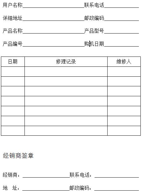 感謝您購買本公司產能品,為確保您的利益,請要求經銷商將店名、地址、購買日期等資料記錄明確,并妥善保存本卡和購機發票,需要服務時,請主動出示本卡和購機發票,以享受應有的權利。